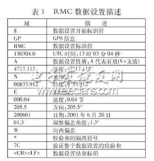 目前几乎所有GPS厂商都遵循美国国家海洋电子协会(National Marine Electronics Association)制定的NMEA-0183V20通信标准格式。TIM GPS接收机的输出语句按串行通信协议,数据格式为8个数据位、1个起始位、1个停止位,无奇偶校验。可以根据需要选择传输速率。其输出语句采用的是NMEA0183即ASCII格式码,输出语句达十多种,包括GGA、GSA、GSV、RMC、RMT、VTG等。这些定位数据语句不仅给出了位置、速度、时间等信息,而且指出当地的卫星接收情况。实际导航应用读取GPS的空间定位数据时,可以根据需要每隔几秒钟更新一次经纬度和时间数据。而更频繁的数据更新就没有必要了,而且不需要了解NMEA0183通信协议的全部信息,仅需要从中挑选出所需要的那部分定位数据。RMC数据设置描述如表1所示,其数据设置示例如下: