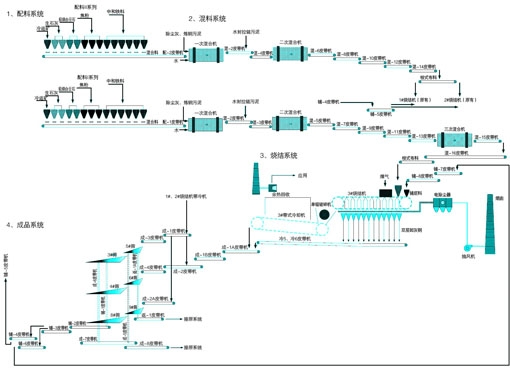 120平方米烧结机系统包括:配料、混料、烧冷、成品、除尘、公辅等系统。工艺系统如图1所示。
