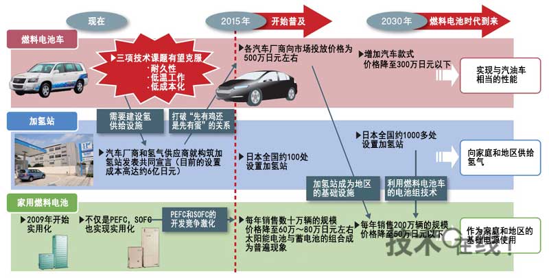 各大汽车厂商均计划以2015年为目标,上市价格控制在500万日元左右的FCV。2015年以后将推进氢供给基础设施的设置及家用燃料电池的普及,2030年或将迎来燃料电池时代。