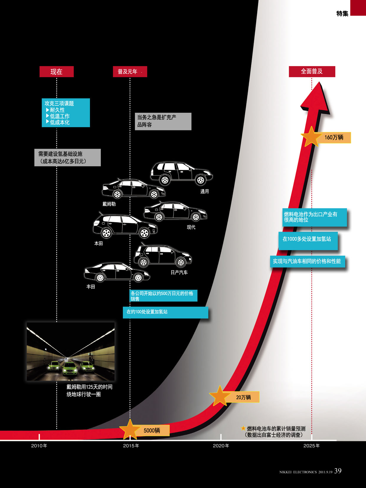 领头的是丰田。该公司在2010年11月举行的“丰田环境技术记者发布会”上宣布,“计划2015年前后上市轿车款FCV。该车将以客户能够接受的价格提供”(该公司代表董事副社长内山田竹志)。