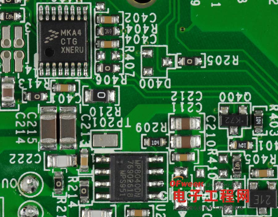 出自飞思卡尔的MKA4有着不一样的神秘。它包含两个相似模具固定在一起的封装。我们认为它可能具有磁性(或电容耦合)隔离器,用来从正弦充电电流中析出控制信号,或作为电流传感器。
