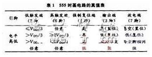 电路初次通电时,因电容C1两端电压不能突变,FX555的2脚为低电平,从表1所示的FX555时基电路的真值表可知,FX555时基电路置位,即3脚输出高电平,内部放电晶体管截止,7脚被悬空,此时正电源VDD通过电阻R1,R2向电容C1充电,使C1两端电压不断升高,约经时间t1,C1两端电压即阈值端(6脚)电平升至2VDD/3,从表1可知,FX555时基电路翻转复位,3脚输出低电平,同时内部放电晶体管导通,7脚也为低电平,此时电容C1将通过R2向7脚放电,使C1两端电压(即FX555的触发端2脚电平)不断下降,约经过时间t2,电压降至VDD/3时,完成一个周期。FX555时基电路又翻转复位,3脚又输出高电平,7脚再次被悬空,正电源又通过R1,R2向C1充电,如此周而复始,电容C1不断处于充电与放电状态,电路引起振荡,3脚将交替输出高电平和低电平。