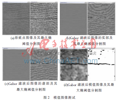 关于Gabor滤波后的输出特征,在参考文献[3,10]中,采用的都是Gabor滤波后图像的实部,在其参数选择中,比较了实Gabor滤波器(RGF)和虚Gabor滤波器(IGF)对图像疵点的分辨率影响,得出在不同径向中心频率和方位角的组合下,RGF的分辨率都要远远好于IGF。本文算法中,以纬疵为例通过如图2所示的实验测试,证明选取Gabor滤波后图像的模值比选取实部对最大熵的应用具有更好的效果。