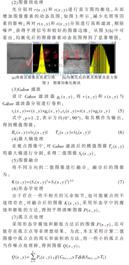 另外,在参考文献[4,8,9]中都分析了疵点检测中熵的应用,采用的都是局部熵,涉及了阈值选择,牵涉到人的因素。本文采用最大熵作为准则,利用式(4)迭代,自动获取阈值,同时结合Gabor滤波,进行最大熵测试。以纬疵和勾丝为例,如图1所示的实验表明,本文提出的方法能获得很好的检测结果,能避免阈值等参数的主观经验选择,排除了人的因素,降低了算法复杂度。