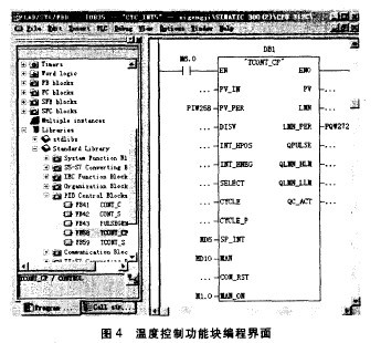 控制器有7个输出可以作为系统控制的控制输出和显示用输出,其中主要利用PV格式化过程变量,可以作为蒸气调节阀阀开度显示。LMN_PER是I/O格式的控制量输出值,这里直接输出到PQW272,在模拟量输出端输出4~10mA控制气动薄膜调节阀。功能模块还有QLMN_HLM、QLMN_LLM上下限报警。这样功能块程序设计基本完成。温度控制功能块编程界面如图4。