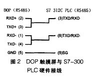 西门子S7-312C PLC通讯口只有MPI接口,不具有标准的RS232和RS485接口,通常触摸屏只连接西门子自己的触摸屏,用自己的MPI接口,但西门子触摸屏价格较高,有时考系统性价比,选用其它品牌,这样通讯协议设定就需要多一些技术,通常采用西门子公司PC-MPI转接电缆连接,这样简单可靠但成本较高,硬件安装多个转换盒,安装不方便。本系统采用直接连接,协议设定就尤其重要,具体设置过程如下:首先通讯速率:19200,8,EVEN,1.(RS485);然后PLC站号:最后是控制区/状态区:DBWO/DBW20。需要注意事项的有此驱动只能用于1台DOP人机界面连1台PLC;PLC通讯速率需改为19200,(8,EVEN,1.);不可使用2个通讯口都用;DOP站号需设为O~15,若超过此范围,则通讯协议自动改为15;没有接连接电缆时,DOP人机界面约5s后,会显示Error message。若接上连接电缆时,DOP人机界面需重新送电,才能连上通讯成功;送电后,因DOP需接受PLC通知后方可连上。故第1次联机所需时间较长,正常情况下,应在5s内连上;此协议为多段来回的通讯(1个命令需DOP HMI与PLC通讯多次,方可完成)。故通讯速度较一般控制器慢。但与S7-300使用PC adapter速度基本相同。具体DOP触摸屏与PLC硬件接线如图2。