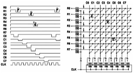 如图8 所示,8×8 数字电阻触摸屏, 基于Altera 解决方案[1]:它采用两层ITO 分别作为水平的sensing line(触摸感测线)和垂直的driving line(加电驱动线),driving line 和sensing line 之间的触点就相当于一个开关,在未接触时,它们之间是绝缘的,而接触发生后,两者发生短路,相当于开关闭合。驱动的时候,其中sensing line 通常由一个上拉电阻施加高电平,同时在driving line 上以一定频率依次在各列中施加负脉冲电压,这样当扫描到触点所在的那一列时,由于触点开关闭合,形成直流通路,使得触点所在行的电压被拉低,形成一个负脉冲,这样就检测到了触点的位置。由于driving line 是依次扫描,所以可以检测到多个触点的位置。