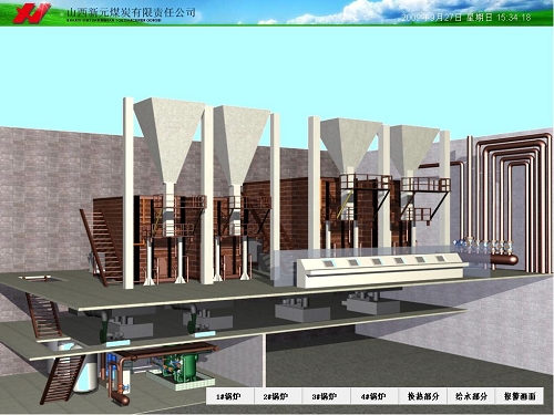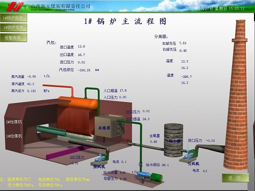 新元煤矿共4台燃煤锅炉,采用6台S7-200的PLC做锅炉主控+公共辅助系统的控制,数据库直接远程读取原监控系统的OPC Server。界面显示炉膛温度、炉膛负压、上锅筒温度、上锅筒压力、蒸汽出口流量、蒸汽管路压力、省煤器温度、烟道温度、鼓风机风量开关、引风机吸风量调节器开关显示、供煤炉排风速度显示、速度调节、现场手自显示、水位报警、水位显示、供水阀前后压力、供水温度、流量、循环泵状态、鼓风机开停状态、引凤开停状态、供水泵开停状态、鼓风机轴温、引风机轴温、风机变频等数据。