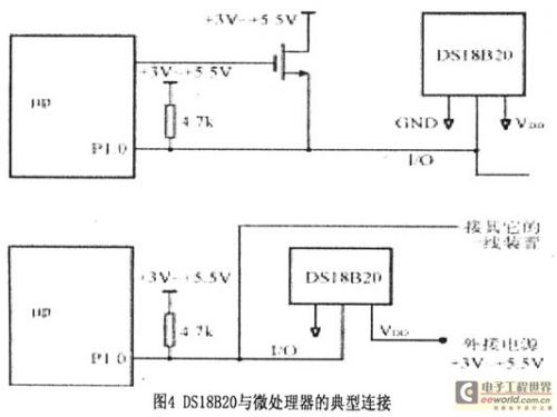 DSl8820采用的是1一Wire总线协议方式,即在一根数据线实现数据的双向串行传输,所以硬件接口电路非常简单。需要注意的地方是:DQ数据线需要接上拉电阻。DSl8820有两种接线方式:寄生电源方式和外接电源方式。图3以MCS一5l系列单片机为例,画出了DSl8820与微处理器的典型连接。图4(上)中DSl8820采用寄生电源方式,其VDD和GND端均接地,图4(下)中DS18820采用外接电源方式,其VDD端用3V~5.5V电源供电。