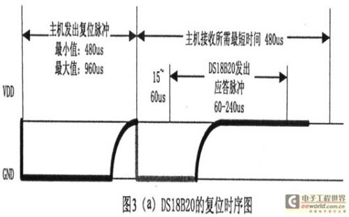 DSl8820的一线工作协议流程是:初始化→ROM操作指令→存储器操作指令→数据传输。其工作时序包括初始化时序、写时序和读时序,如下图3所示:
