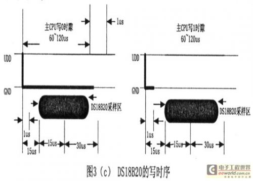 对于DSl8820写0时序和写1时序的要求不同,当要写O时序时,单总线要被拉低至~>60us,保证DSl8820能够在15us到45us之间能够正确地采样IO总线上的“O”电平,当要写l时序时,单总线被拉低之后,在15us之内就得释放单总线。