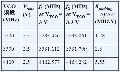 VCO推压的测量方法如下:向VTUNE引脚施加直流调谐电压,改变电源电压并测量频率变化。推压系数是频率变化与电压变化之比,如表1所示,使用的是ADF4350 PLL.