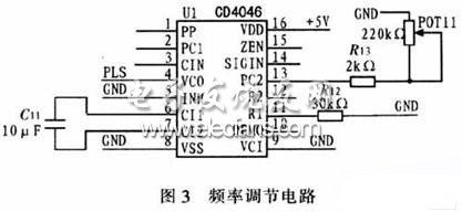 图3为频率调节电路。通过调节CD4046外接电位器POTll,控制VCO输出脉冲的频率,根据设计要求,该电路将输出一个变化范围在1~6 kHz之间的脉冲信号PLS,将该信号作为CPLD的输入信号。在CPLD内部通过计数延时和占空比设计要求,最终输出一个频率在400~3 000 Hz之间符合占空比要求的逆变触发信号,并可通过POT11调节该信号的频率。
