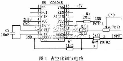 图l为占空比调节电路。该电路是将调节器输出的电压信号作为压控振荡器VCO(Voltage CONtrolled Oscillator)的输入信号,此信号是一个在0~5 V之间变化的直流电压信号,即INPUT信号,由于VCO是一个电流控制振荡器,对定时电容C1的充电电流与从引脚9输入的控制电压成正比,使VCO的振荡频率正比于该控制电压。当VCO控制电压为0 V时,其输出频率最低;当输入控制电压等于电源电压VDD时,输出频率则线性增大到最高输出频率。VCO振荡频率的范围由R1、R2和C1决定。VCO振荡频率由CD4046的引脚4直接输出到CPLD处理单元,CPLD内部通过对该脉冲信号的计数来控制逆变触发脉冲的宽度,来调节触发脉冲的占空比。