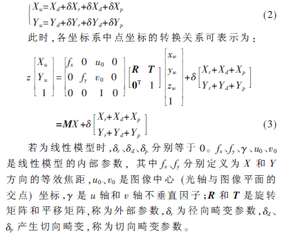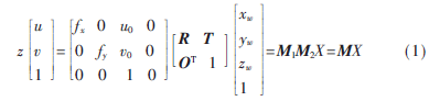 世界坐标系中的点到相机坐标系的变换可用一个正交变换矩阵R和一个平移变换矩阵T表示,fx、fy、γ、u0、v0是线性模型的内部参数,其中fx、fy分别定义为X和Y方向的等效焦距,u0、v0是图像中心(光轴与图像平面的交点)坐标,γ是u轴和v轴不垂直因子;R和T是旋转矩阵和平移矩阵。若已知矩阵M1、M2,就可建立起世界坐标和像素坐标的对应关系。相机的标定任务就是求出每个变换矩阵中的参数。