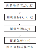 相机标定是指建立摄像机图像像素位置与场景点位置之间的关系,其途径是根据相机模型,由已知特征点的图像坐标和世界坐标求解相机的模型参数,如图2所示。相机需要标定的模型参数分为内部参数和外部参数,转换关系为: