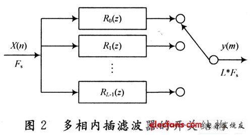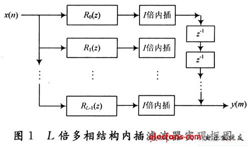 D-1。式(5)即为数字滤波器H(z)的多相滤波结构。针对本文的应用,此处给出一个I倍内插器多相滤波结构的实现框图,如图1所示。其中,Rk(z’)=E(I-1-k)(z’)。