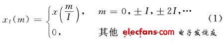 整数倍内插就是指在两个原始抽样点之间插入I-1个零值。原始序列x(n)内插后的序列和频谱分别为: