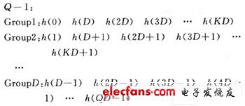式中,N为滤波器长度。如果将冲激响应h(n)按下列的排列分成D个组,如N不为D的整数倍,则将h(n)后补零,使得滤波器长度N为D的整数倍,即N/D=Q,Q为整数,则: