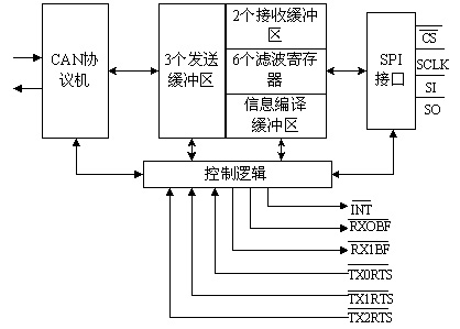 在CAN中应用的元器件主要包括CAN控制器和CAN收发器。本文选用的是独立CAN控制器。PHILIPS公司的SJA1000管脚太多,占用过多的I/O口,MCP2510是目前市场上体积最小的CAIN控制器,通过SPI通讯方式与微处理器连接,连接端口少,所以系统选择MCP2510作为 CAN控制器。MCP2510只要跟MCU和驱动芯片(8X250 )就可以构成一个简易局域网的节点。MCP2510可以完全实现CAN2.0A和 CAN2.0B协议。图2为MCP2510芯片的内部结构图。