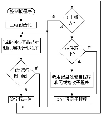 系统软件的设计分为以下几个部分:CAN节点通讯程序、控制板程序(包括键盘输入程序、无线接收程序、IC卡通讯程序、液晶界面控制程序)、电机板程序三个大部分。控制板上的IC芯片包含控制板程序和CAN通讯程序。电机板上的IC芯片存有CAN通讯程序和电机板程序。CAN节点要有效、实时地完成通讯任务,CAN通讯软件设计是关键。它包括初始化程序报文发送子程序,报文接收子程序和出错处理子程序等。