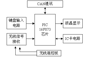 控制节点采用PIC16F873进行控制和通讯控制板的结构如图。控制板由以下电路组成:键盘输入电路、IC卡控制电路、液晶显示电路、无线信号接收电路、主控制电路、CAN通讯电路。图3为控制节点结构示意图。