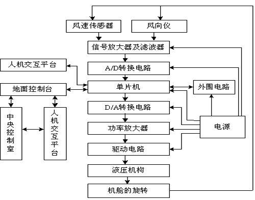 由上可知以往的风力发电机是把所采集到的风能的信息交给地面控制台,而本设计使机舱有一定的主动性。其原理是当风速传感器和风向仪采集到风力资源的信息,放大并进行模数转换该信息后,进入到单片机利用模糊控制算法进行智能处理,把得到的结果通过后向通道,驱动液压电机,是机舱旋转至迎风的方向。如果风速和风向稍有变动,则风速传感器和风向标重新进行采集信息,使风力发电机实时的得到控制,充分利用风能。当然如果要进行人为的操作,如检修、维护风力发电机时,可通过中央控制室的人机交互平台发送停机信号之机舱。如果风速小于或者大于额定风速时,单片机发送偏离迎风方向的命令,以防止风力发电机在大风时的破毁和对电网的冲击。