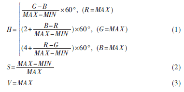 HSV模型[5]是人们用来从调色板或颜色轮中挑选颜色的彩色系统之一。HSV表示色调、饱和度和数值。假设所有的颜色都已经归一化到[0,1]范围。在RGB 3个分量中,设定最大的为MAX,最小的为MIN,则RGB到HSV的转换公式为: