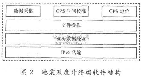 基于IPv6的SI一2型地震烈度计的软、硬件资源由加速度传感器,数据采集模块(A/D),电源,嵌入式系统(CPU),符合802.11b标准的无线网卡,GPS,内置测控软件等模块构成。市场上现有的嵌入式系统自带的操作系统一般是Linux 2.4内核,为支持IPv6须将操作系统的内核进行重新编译,升级为2.6版本内核。图1所示是SI一2型地震烈度计的总体架构。