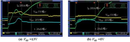 在不同的栅级电压下测量短路电流,测试波形如图2所示,采用的功率MOSFET为AOT266。图2(a):VGS电压为13V,短路电流达1000A,MOSFET在经过47μs后电流失控而损坏;图2(b):VGS电压为8V,短路电流仅为500A,MOSFET在经过68μs后电流失控而损坏。电流测试使用了20:1的电流互感器,因此电流为200A/格。