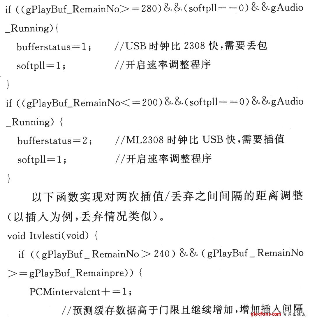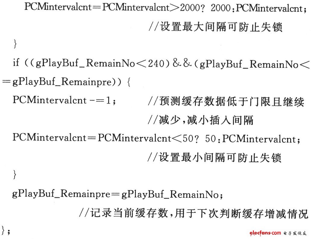 之前采用简单的缓存门限控制方法判断是否需要插值,即当缓存高于某门限时,丢弃一个PCM样点。而当低于某一门限时,插入一个PCM样点,由于时钟速度差异的长期固有性,在插入/丢弃一个PCM样点后,缓存数量仍然可能继续减少或增加,从而造成程序无规律的爆发式的插入或丢弃数据操作,产生不可接受的噪音。