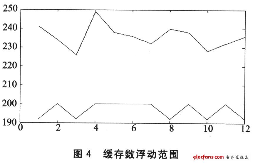 在播放至少10 min稳定以后,利用变量rangel和range2跟踪缓存内数据数量波动范围,记录最大值和最小值,分12次测试,如图4所示。