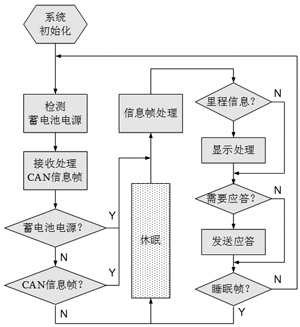 在系统启动后,屏幕显示提示信息,用户输入时间,日期信息确认后显示屏开始显示日期信息,此时汽车显示速度为零。汽车启动后系统实时显示经过处理的近似车速和已经行驶的里程信息。在行驶的过程中,系统通过解析车身总线发送来的CAN信息帧进行汽车的里程计数,单片机利用定时中断定期对计数值进行统计计算,从而得到速度等信息,程序不断将速度值和门限值进行比较,如果超过给出报警提示。