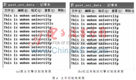 图4(a)是默认引擎的识别效果图,图4(b)是经过训练的引擎识别效果图。通过对比可以看出,未经训练的识别效果错误率高达18.59%,而经过训练的引擎识别效果明显好于默认引擎识别的结果,错误率仅为7.7%。但是在一些图像伪影和不连续处,两个引擎都出现了不同程度的错误。其原因在于目前的文字识别理论还尚未成熟,难以达到百分之百的文字识别精确度。