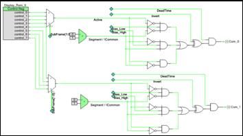 下面的工程范例是使用PSoC 3/5在PSoC Creator环境中实现和配置的。这个项目配置为可以实现数字相关和密度调制两种方法,1/2 和1/3偏置。在工程文件中通过简单地改变一些参数,工程文件就可以实现任何LCD控制技术。有两个主要的LCD控制部分。第一个驱动控制排序,如图3所示。第二部分是引脚驱动逻辑,见图4,其获得各种控制和驱动信号,并用适当的逻辑结合来生产所需的驱动波形。