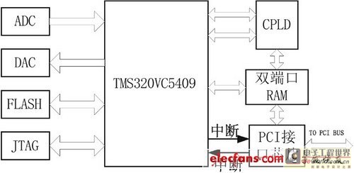 为了体现PCI总线速度快的优点,我们选用速度较快的双端口RAM CY7C133-25,最大传输速率为25ns。双端口RAM在DSP的数据空间的地址映射为8000H-87FFH。