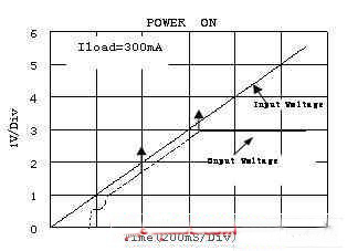 在测试压差(Dropout)时不同的厂家有不同的标准。德州仪器(TI)电压差定义为输出电压较其标称值跌落2%时的输入、输出电压的差值。其它的如,美信(Maxim),圣邦微电子(SGMC)电压差定义为输出电压较其标称值小于100mV时的输入、输出电压的差值。 如图为圣邦微电子的SGM2007负载为300mA时输入电压和输出电压的曲线。