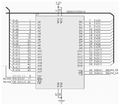 DRAM 只能将数据保持很短的时间,它使用电容存储,必须经常刷新电路来保存数据,它的读写过程比较复杂,时间较长,动态功耗较大,总线利用率比较低。不过DRAM 的存储容量大,价格便宜,被大量用在服务器和电脑中。由于DRAM 读写过程比较复杂,本系统要求存储器有快速的读写响应,所以设计中选用SRAM 作为存储器。本系统所用的LED屏大小为512×64,每个像素数据(RGB)占用24bit,则一场画面的数据量为512×64×24=768kbits.本设计选用ISSI公司的IS61LV25616芯片来存储视频数据。SAA7111输出16bit视频信号,16位数据线正好方便存储数据。它的容量为256×1 024×16bit,足够存储一场视频数据,并有留有充足的容量供系统以后的升级。SRAM 的电路设计如图2所示。