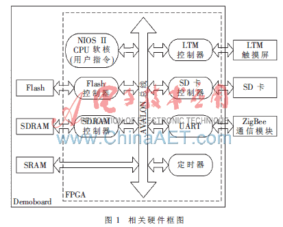 系统中顾客使用终端触摸屏浏览服务信息并实现相关操作,通过无线局域网络和前台通信。各个点菜终端作为独立系统工作,所有数据传到前台上位机协调处理。本文仅介绍与μC/GUI相关的点菜终端构成部分。终端硬件框图如图1所示,利用片上可编程系统(SoPC)技术将Nios II处理器、外设接口控制器等功能模块集成到FPGA,构成可编程片上系统[2]。SDRAM、Flash控制器用于处理程序和数据的存储;512 KB SRAM作为图像数据缓存区;FPGA内部自定义LTM控制器和SD卡控制器模块,辅助软核工作,操作触摸屏并读取SD卡内的JPEG图片;UART接口用于和移植到CC2430的ZigBee模块通信;采用定时器以嵌入?滋C/OS II操作系统。