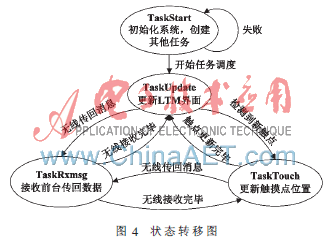 系统使用接口函数OSTaskCreateExt 创建任务,根据系统要求,设计四个任务,分别是:初始化任务(TaskStart)、接收消息任务(TaskRxmsg)、响应触摸任务(TaskTouch)和更新任务(TaskUpdate)。任务间通过信号量、全局变量等方式通信,具体状态转移如图4所示。