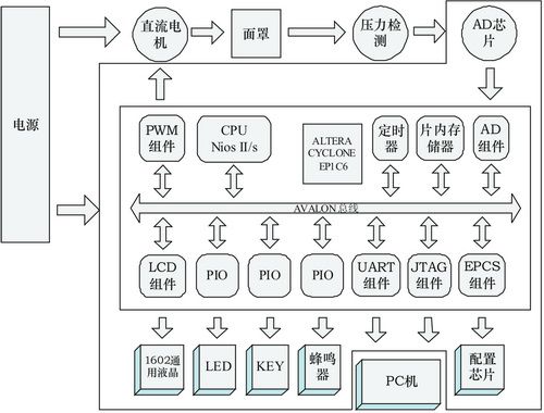 主控系统的核心FPGA采用Altera公司Cyclone系列的EP1C6T144C8。CPU即为Nios II软核处理器,对整个系统进行统一管理。折线框内为主控板,除下载、调试用的PC机外,对直流电机及主控板需单独供电。直流电机工作后将气流送至面罩内,电机根据端的信号来调节气流的大小。在面罩内装有压力检测模块,通过A/D转换返回至主控板,用来对气流进行回馈调节。面罩供患者使用。