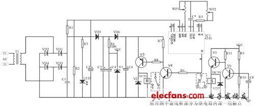 该电路核心部分由IC4541构成,延时设定由RP2、C*设定,A-B端根据需求接相应高、低电平(设定端)内部2绕组闭锁继电器采用DC12V(因继电器工作电压与IC4060组成延时电器要低,则为保证其驱动则分别由V6、V7、V1、V3构成)。其中C2为二次储能器件,可根据延时的长短予以调整,C4为完成S置位线圈工作。