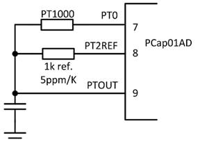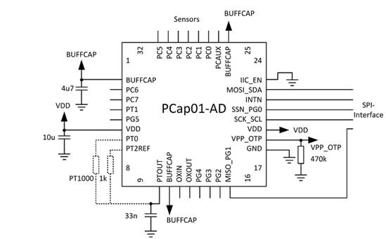Pcap01内部有一个非常强大的温度测量单元,用户可以选择外接温度传感器测量,或者应用内部集成的铝电阻作为温度传感器电阻。内部铝电阻的温度系数为TK ≈ 2800 ppm/K,一般的温度测量完全可以满足。当然如果对于温度测量要求较高,则需外接高精度温度传感器(如PT1000)来进行测量。