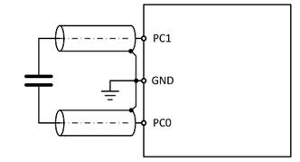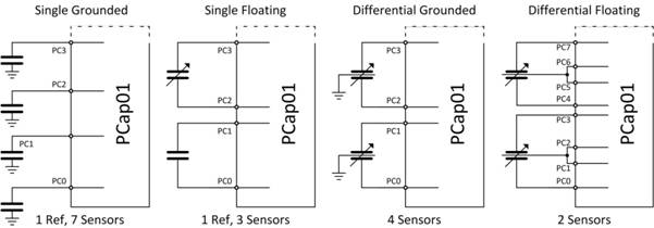 对于电容传感器的测量,芯片提供了非常灵活的连接方式,对比典型的连接方式如下所示: