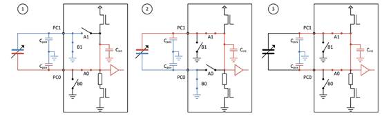 通过上面的传感器连接的方式,可以补偿连接传感器两端的导线寄生电容,消除导线对于测量结果的影响。那么如果想要进行导线补偿,3个在漂移模式的测量需要被进行如下:
