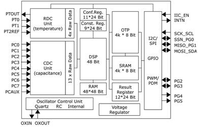 芯片内部带有一个48位的信号处理单元,这个处理单元将会处理CDC(电容测量)和RDC(电阻测量)的信息,获得测量数据将结果给到芯片输出端口。所获得的粗值数据将会存放在内部RAM当中,而内部有OTP或者SRAM可以用于客户进行自己程序的编写。芯片在测量完成后,一定会进入SRAM或者OTP执行内部程序,最简单的就是将测量结果读出写入到芯片的。那么还可以在程序当中进行非常多的工作,普通单片机的功能都可以在芯片内部的DSP处理单元中实现。acam公司为芯片提供不同版本的固件,适合不同种类的应用。例如提供了测量温湿度的固件,当您将芯片应用于温湿度测量的时候,可以对于温度和湿度进行非常方便简单的校正和补偿,内部还有集成的计算软件,更加方便客户的开发。