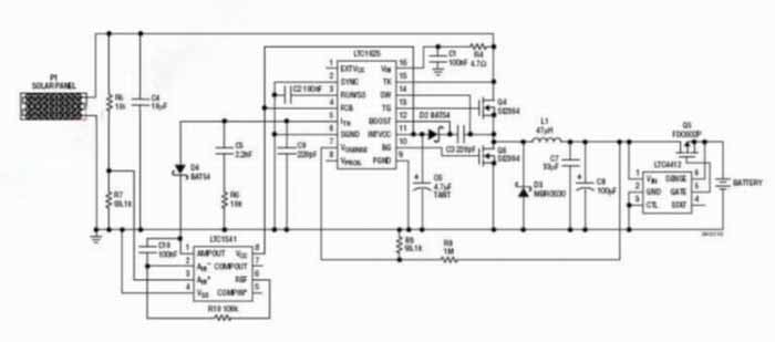 图中的电路被置于太阳能电池板和电池之间,用于调节电池浮动电压。基于LTC1541的附加控制环路强制充电器在最大电池板功率点上运作。这种效率的提升缩减了所需的电池板尺寸,因而降低了总体解决方案的成本。当电池板峰值电源电压和电池电压之间存在失配时,这款电路的重要优点表现得尤为突出。