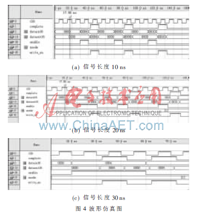 为了测试输出数据长度符合FIFO接口的时序要求,分别进行了图4(a)、图4(b)、图4(c)所示的波形仿真,输入信号的持续长度分别为10 ns、20 ns、30 ns。如图所示三种输入的输出皆为10 ns保持时间, 同时输出10 ns write_en使能信号,符合FIFO接口要求。
