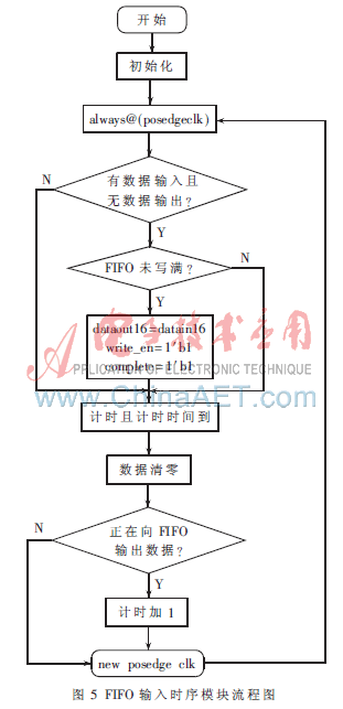 模块流程图如图5所示。整个模块以posedge clk为同步时钟进行循环判断。当写入模块使能enable有效且写入完毕信号complete无效时,首先对FIFO的存储情况进行判断,当FIFO中字节小于7 FH时,说明FIFO未被写满,可以向其输入数据。数据输入FIFO的同时,写使能write_en置为有效,对于计数模块输出的接收完成信号complete信号置为有效。对一个周期的计数寄存器counter进行判断,如果counter为1即计时一周期到,则寄存器清零。counter的数值是在每次posedge clk信号到来时对write_en判断后进行加1,即当write_en为有效电平时,counter才被加1用来计时。