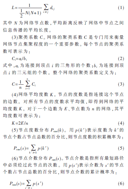 用图的顶点(或称为节点)代表所研究的事物,用图的边表达事物之间的联系,这样能较好地刻画出所研究的系统。在复杂网络中,人们最先考虑的是其统计特征:平均路径长度、聚类系数和度的分布律。具有较短的平均路径长度、较高的聚类系数是小世界网络[8]的典型特征,网络的度分布服从幂律分布时被称为无标度网络[9]。